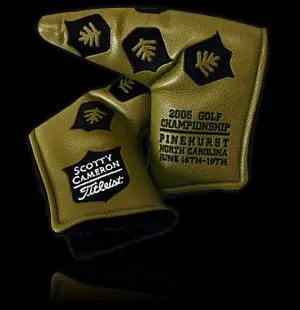 2005 Golf Championship To commemorate the 2005 Golf Championship Scotty offered this very classic head cover. This is a cover that definitely captured the feel and the allure of the 2005 Championship. Done in a richly textured olive green the cover features dancing pine trees in a regal black crest. The Cameron/ Titleist crest is embroidered on one side of the neck and 2005 Golf Championship Pinehurst, North Carolina, June 16th-19th on the other. This is a cover so intricately designed it has almost 33,000 stitches and could only be made at the rate of one per hour.