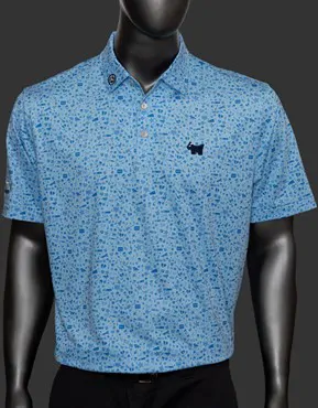 With a whimsical printed pattern featuring icons of music, romance, night life and more, this new classic performance polo in cottage blue is crafted from a lightweight, easy-care tech fabric that’s 92% polyester and 8% spandex. Accented with our expertly embroidered Scotty Bulldog, Circle T and Scotty Cameron Fine Milled Putters Laguna Font sleeve treatment, this wear-anywhere polo is a welcome addition to any golfer’s wardrobe. Original Price: $98.00