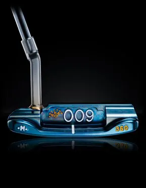 Raw carbon steel with Scotty's Chromatic Blue finish sets the stage for a welded SSS plumbing neck with our hand-flamed Chromatic Bronze finish. The result is a color combination you'll only find with this 34-inch 009M (Masterful) Carbon Chromatic Blue putter. Add a few hand-hammered stamps and you have a stunningly unique setup that comes complete with a Tour Rat Circle T headcover and Dancing Scotty Cameron Pistolini Circle T grip. Original Price: $6,000.00