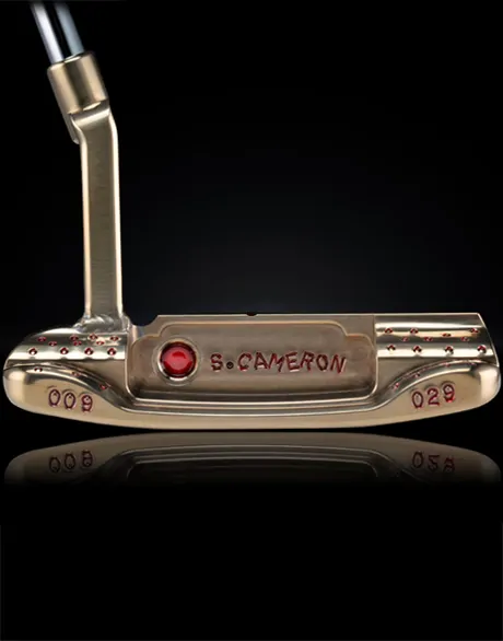 Nicknamed a “Fancy Back” for the hand-stamped dancing snow on the back step, this 34-inch 009M (Masterful) SSS in Chromatic Bronze with a welded plumbing neck also pays homage to the history of putter making with its 009-029 Scotydale badging. To find similar items, please visit the Scotty Cameron Golf Gallery in Encinitas, CA. Original Price: $6,000.00
