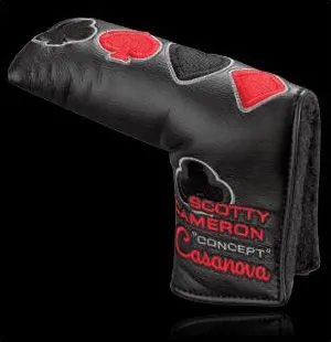 2010 Holiday Casanova Scotty’s H10 "Concept" Casanova putter conjures up images of the gentleman gambler, the modern day Casanova, patrolling the tables of Monte Carlo. With the familiar four suits of playing cards—clubs, spades, hearts and diamonds—this Special Release headcover is made for men of mystery everywhere, designed with a daring black heart and red spade for a manly, devil-may-care flourish.