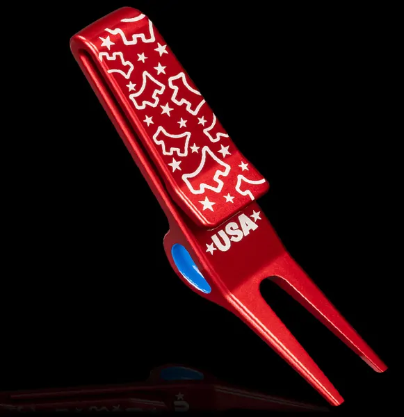 Intricately laser etched with a Stars & Scotty Dog design, Scotty's latest clip pivot tool is precision milled from aluminum and anodized in bright dip red. As functional as it is stunning, this handy tool is a great way to repair pitch marks on the greens.
