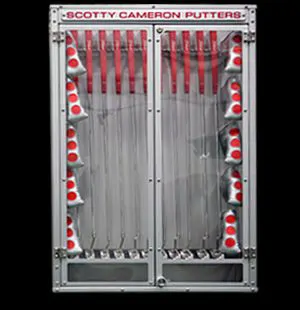 Putter Display Introduced in 2011 to select golf shops worldwide, Scotty made a few of his elegant putter displays available to Club Cameron. Entirely designed and built here in the USA, Scottys putter display can easily accommodate, protect and handsomely exhibit up to ten Scotty Cameron putters and headcovers. The lower tray is the perfect place for showing off accessories and more. With top and bottom locks, everything is kept secure.